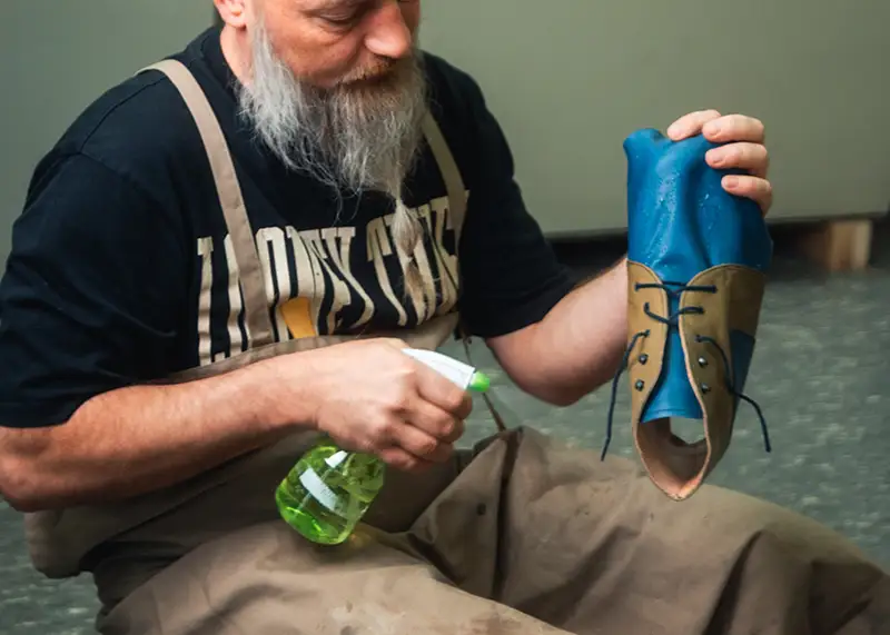 Zusammen erläutern Ausbilderin Yvonne Buschmann und Ausbilder Alexander Fuchs aus dem Bereich der Orthopädie-Schuhtechnik, was zu ihren Aufgaben gehört und welche Inhalte die Umschulung umfasst.